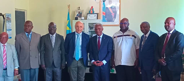 L’Ambasciatore Dino Sorrentino tra il Rettore Gilbert Kishiba Fitula (alla sua sinistra) e il Prorettore, Jean-Marie Dikanga Kazadi (alla sua destra). Alla sinistra del Rettore, Franck Kalala Mutombo.